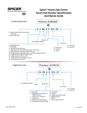 The Spicer smart part number identification system reflects actual location, model, ratio, and GAWR, making ordering your medium- and heavy-duty carriers easier than ever. See the examples below.